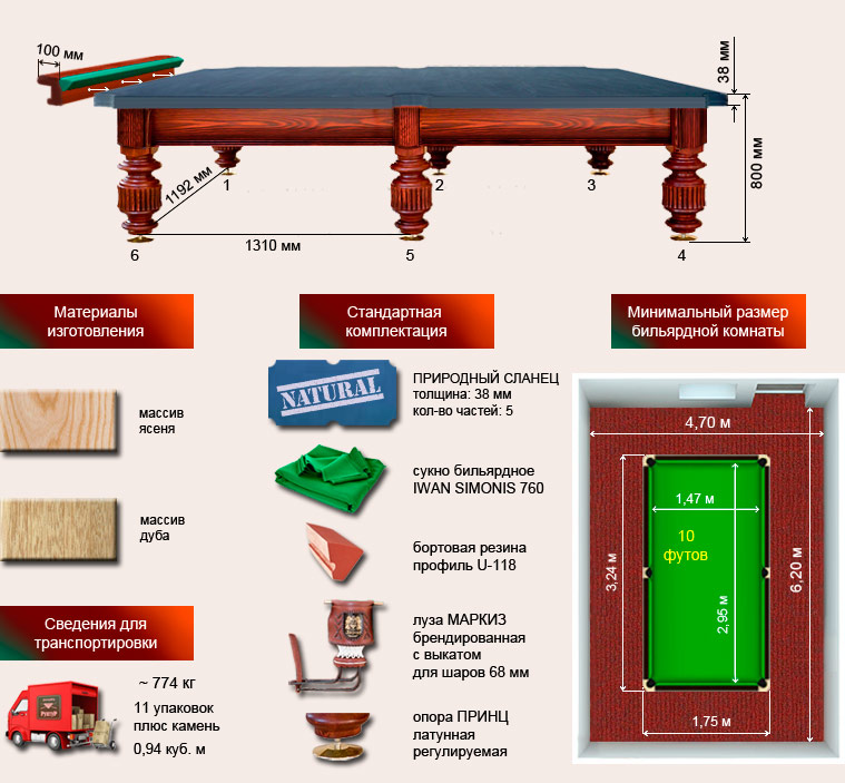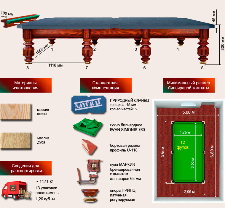 Элегантный бильярд с точеными ножками и пышными жабо на бортах. Для поклонников классического стиля. Изготовлен в строгом соответствии всем принятым спортивным стандартам.
