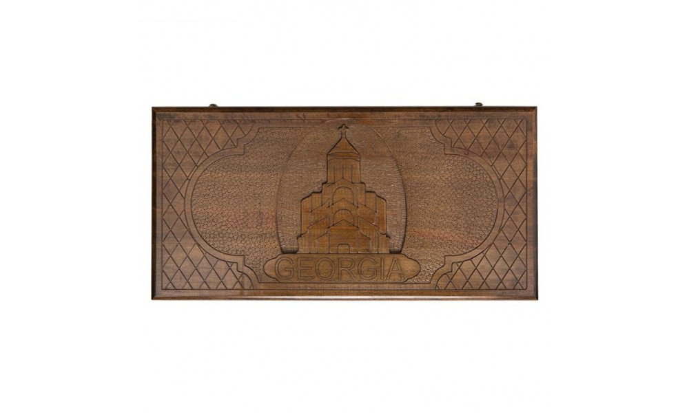 Нарды резные Грузия выполнены полностью вручную и могут похвастаться красивым оформлением. С наружной стороны, в узорном окаймлении, вырезан грузинский храм, причем сделано это максимально качественно и детализировано. На другой половине разлиновано поле для игры в шашки, что позволит расслабиться в перерыв между напряженным баталиями в нарды.